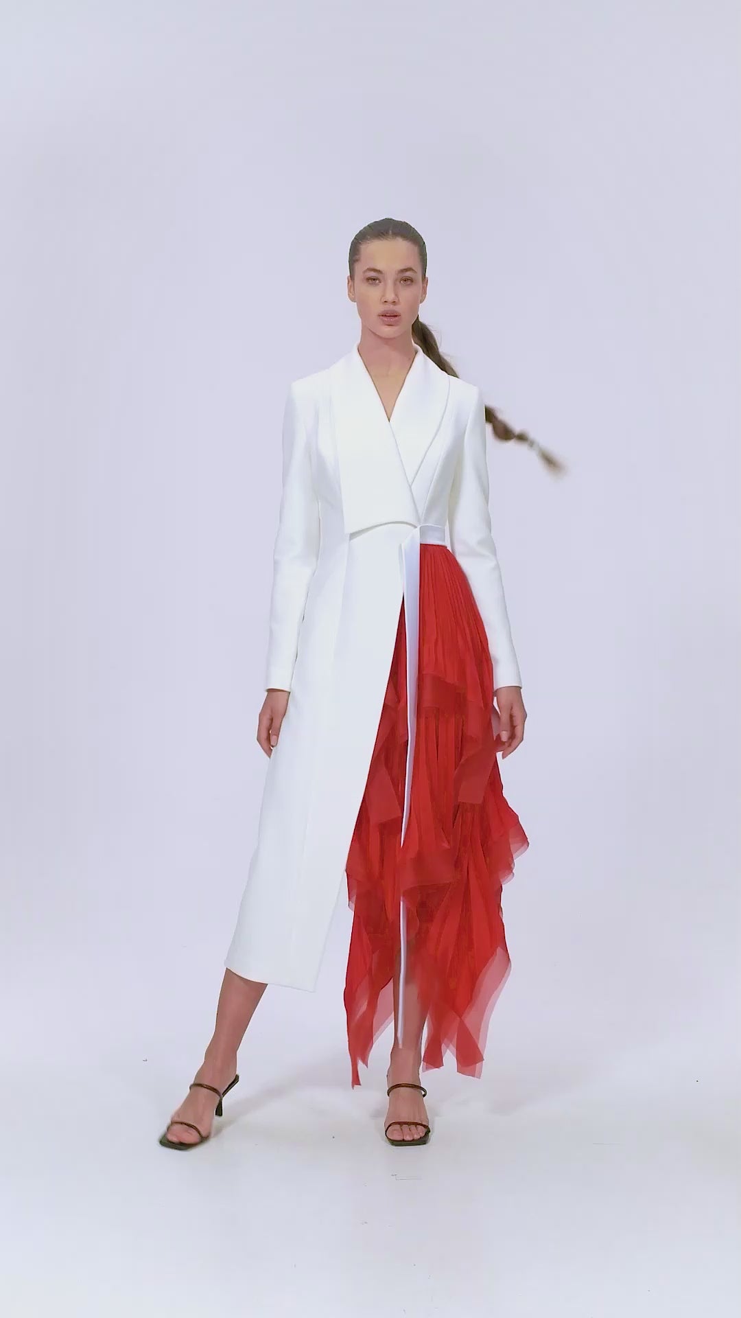 Double-breasted asymmetric dress with double-layered one-side pleats and a long belt that works as a closure.