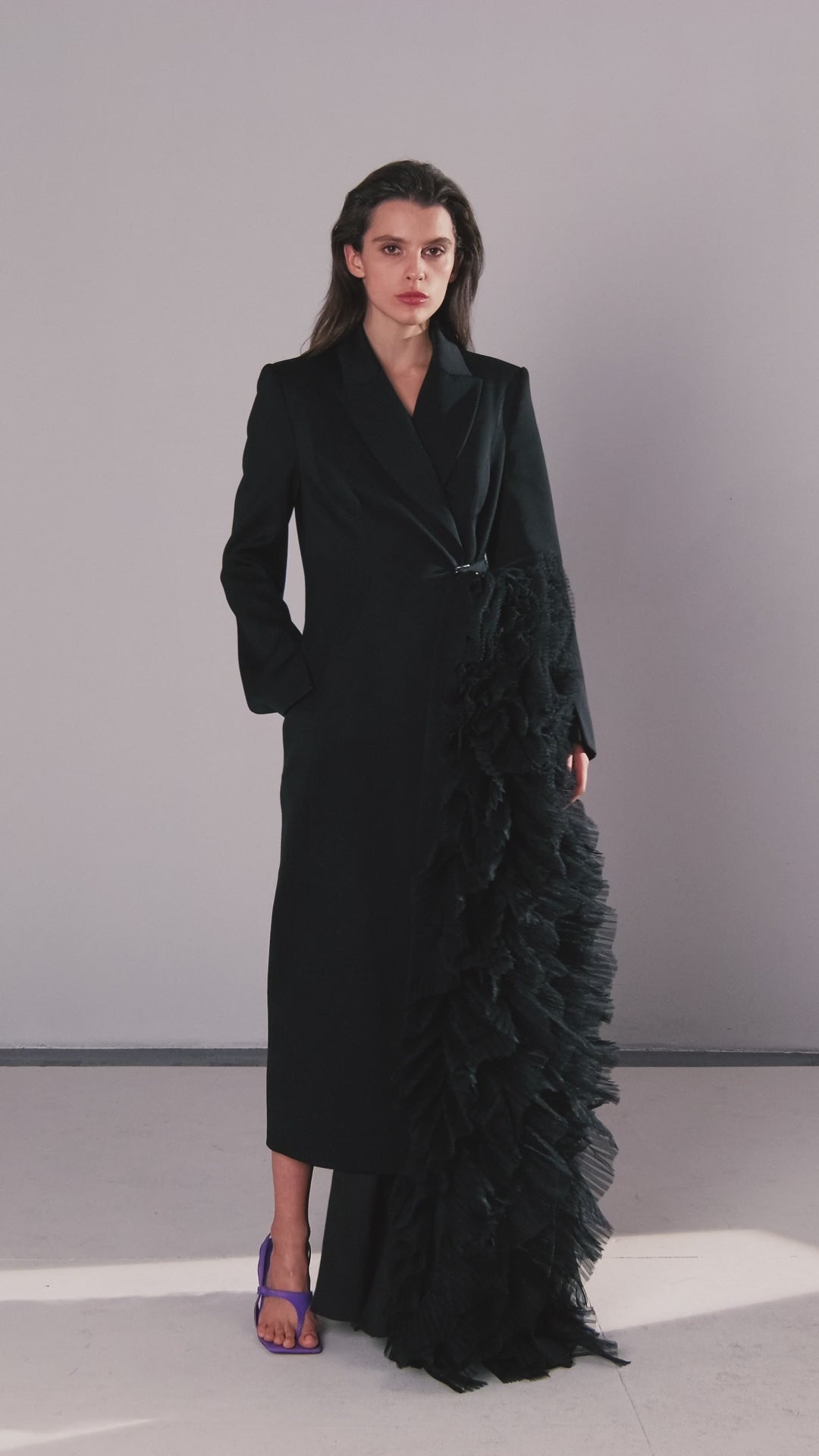 The underskirt of the dress is stitched with corrugated tulle that gives a fabulous volume on the left side down the waistline. It has a hidden button on the left, and its corset cut creates a truly fit-and-flare silhouette.