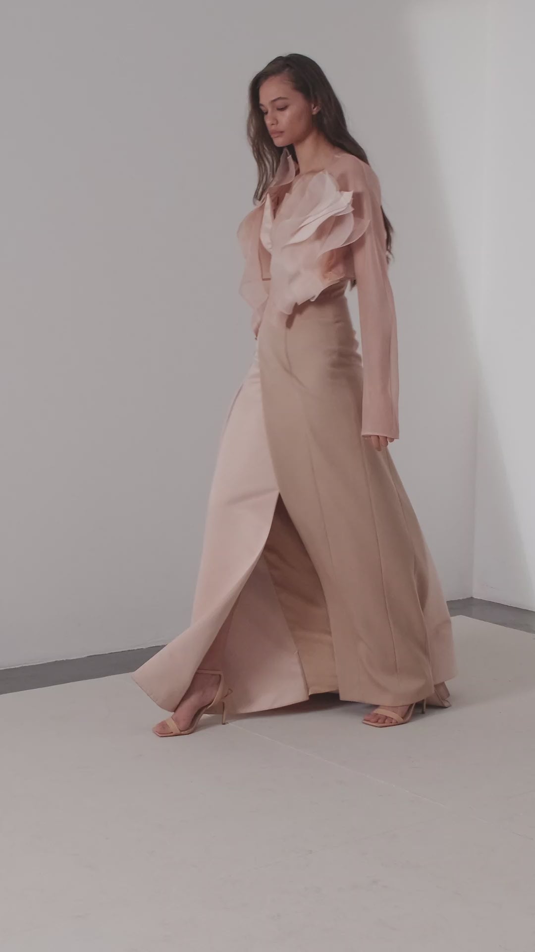 A very special item from the FW'23 collection, this sheer bolero has a gorgeous voluminous decor that is hand-made by the Valery Kovalska atelier. Made of soft silky organza, the contour of the decor replicates the shape of a rose flower. The wide silk stripe effortlessly falls down creating a soft wave.