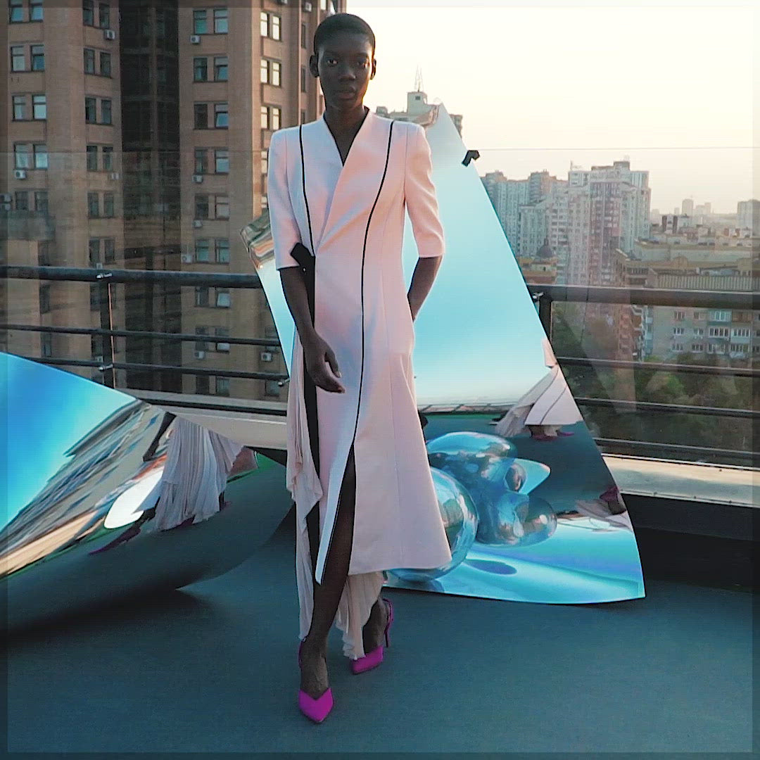 3/4 sleeves dress with a silky light pleated part on the right side under the waistline. A sculptural cut of the dress is highlighted with a contrast backline that matches with a contrast belt. The dress is with 2 snaps closure.