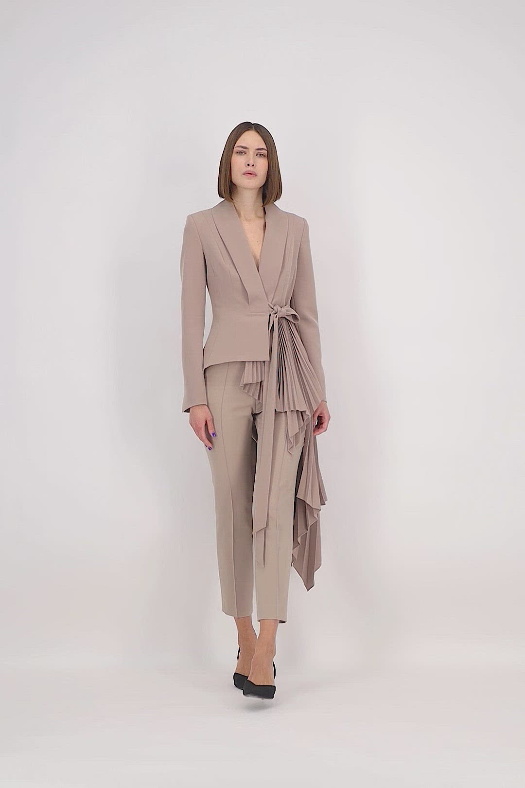 Special edition solid color asymmetric tuxedo jacket with pleated detail under the waistline and a belt.