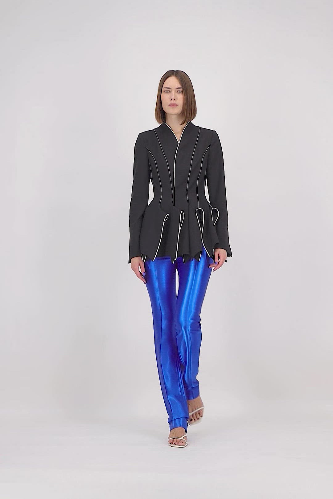Architectural arches tuxedo, with contrast seams. Beautiful, technically advanced pattern cutting to flatter the female figure.