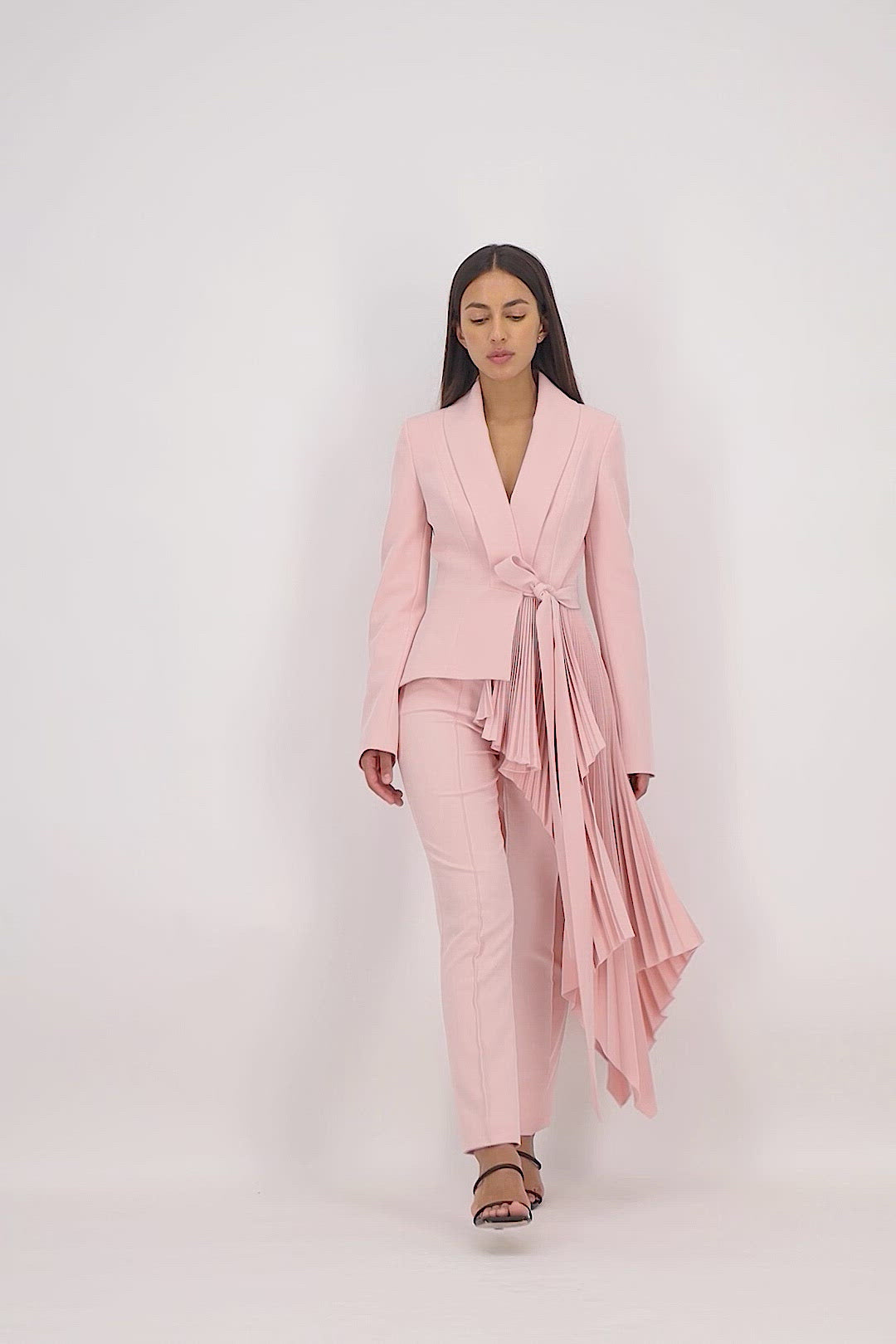 Special edition solid color asymmetric tuxedo jacket with pleated detail under the waistline and a belt.